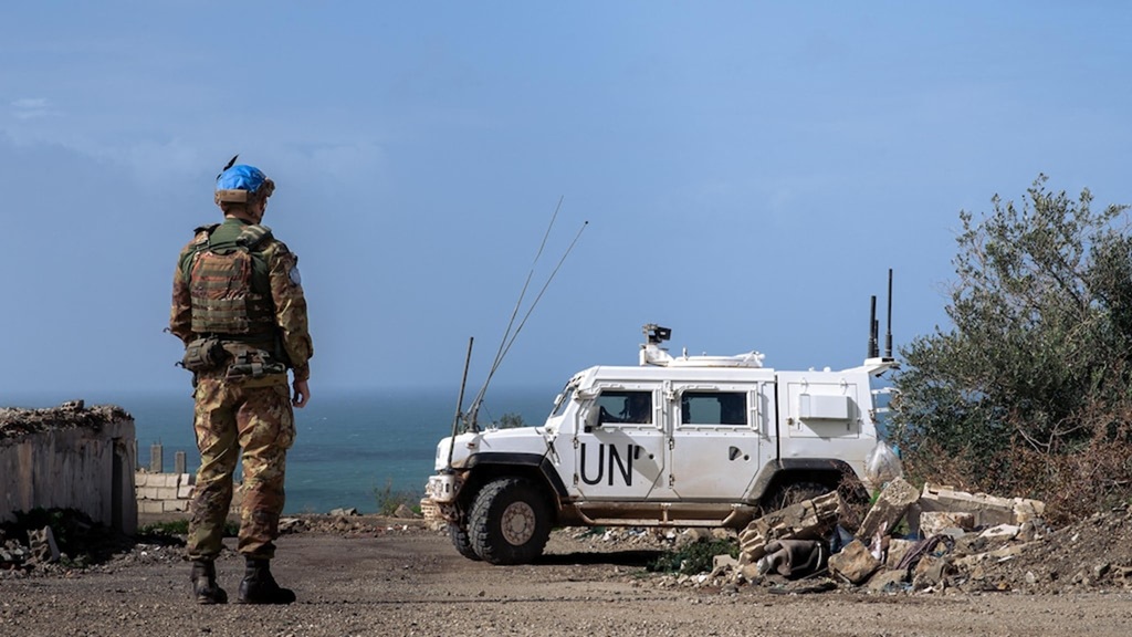 جندي في قوة الأمم المتحدة المؤقتة في لبنان (’’يونيفيل‘‘ UNIFIL) يقف بالقرب من مركبته المصفحة في جنوب البلاد في 22 شباط (فبراير) 2026.